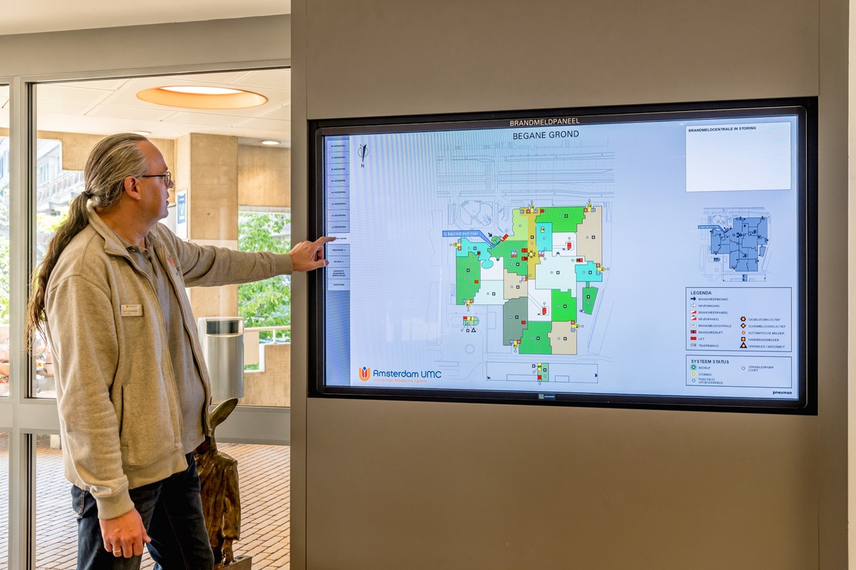 Een brandmeldpaneel is verplicht om detectiezones weer te geven. Er wordt ook op melderniveau gesignaleerd. Het tesktvesnter rechtbovenin meldt direct het alarm dat ook op de brandmeldcentrale staat. Dit is geen eis maar geeft wel veel informatie.